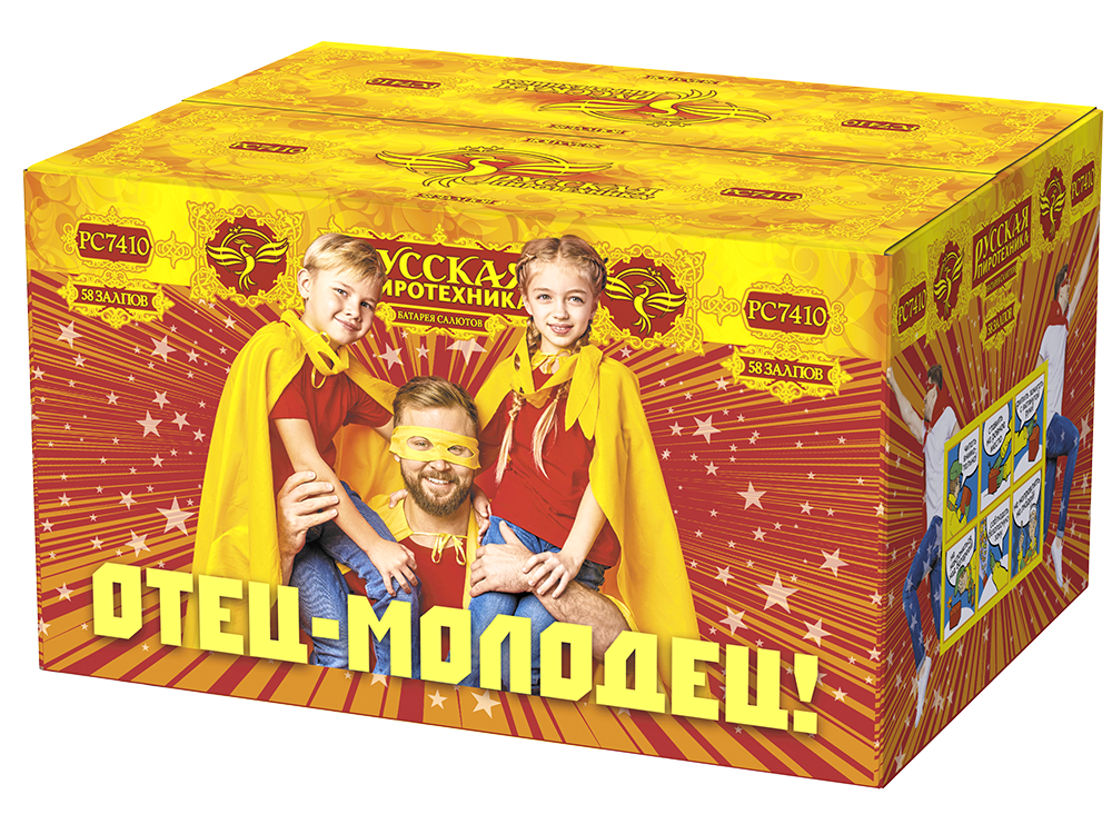 Фейерверк Отец-молодец! Жуковский РС7410 купить 11 990 руб. 58 залпов Русская пиротехника крупнейший магазин время доставки до 5 часов в Жуковском | zhukovskij.torgsalut.ru